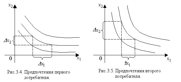 У первого потребителя (рис.3.4) низкая предельная норма замещения напитка соком - он готов отказаться от очень небольшого количества сока ради напитка (