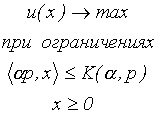 4. Оптимизационная модель задачи потребительского выбора. Пусть Мы рассматриваем статическую задачу, поэтому эти величины не зависят от фактора времени. Параметры pi и K считаются постоянными величинами, причем цены считаются рыночными, а доход не структуризуется, то есть нас не интересует из каких частей он складывается. Компоненты xi вектора являются неизвестными переменными. Модель составляется как раз для определения "оптимальных" значений этих переменных для данного потребителя. Цель потребителя будем описывать с помощью функции полезности С учетом всего сказанного выше, модель задачи потребительского выбора имеет вид:
