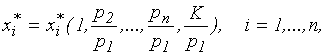 Оптимальной решение этой задачи обозначим Для функции спроса однородной нулевой степени объем потребления зависит не от цен, как таковых, и дохода, а от отношений цен (относительных цен) и от отношения денежного дохода к цене (реального дохода). Выбирая какой-либо товар, например, товар i=1, в качестве "единицы измерения" (эквивалента) и полагая коэффициент пропорциональности