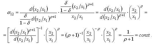 Для практики особый интерес представляет случай постоянства эластичности замещения, т.е. независимость отношения Покажем, что таким свойством обладает производственная функция CES (для простоты рассмотрим случай двухфакторного производства (см. (4.2.5)). С этой целью сперва вычислим предельную норму замещения для функции CES: