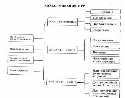 Игра — это деятельность, выполняемая ради самой деятельности иради забавы. В формировании и развитии личности игра имеет важное значение. Я.А. Коменский рассматривал игру как отдых от дел серьезных, деятельность, которую можно использовать в целях обучения и воспитания. К. Д. Ушинский видел в игре ребенка серьезное занятие, в котором он осваивает и преобразует действительность: в действительной жизни ребенок не более как существо, не имеющее никакой самостоятельности; в игре же он — уже зреющий человек, пробующий свои силы и самостоятельно распоряжающийся своими же созданиями. П. Ф. Каптерев все многообразие детских игр разделял на игры-забавы (мускульные/ осязательные, слуховые, зрительные забавы младенцев); игры-развлечения (для развития памяти, для развития мысли, для возбуждения чувств у детей старше года); подражательные игры (воспроизведение физических действий и отношений между людьми); творческие и общественные игры (ролевые и сюжетно-ролевые). Специально он рассматривал игры познавательные и с преобладающим художественным элементом. Ж. Пиаже рассматривал сенсомоторные, символические игры и игры с правилами. В современной литературе игра часто определяется как свободная деятельность в воображаемой ситуации, способствующая усвоению социального опыта. Такая игра подразумевает, как правило, использование предметов-заместителей, игрушек, что проявляет ее двуплановость: с одной стороны, игра — отражение реальных отношений, а с другой стороны — имеет символический, условный характер. Среди многочисленных классификаций детских игр можно выделить описанную Р. Коэй и Г. Мэйес: предметно-манипулятивные игры, имитационные, строительно-конструктивные, режиссерские. Все они могут быть использованы в воспитательных целях, организовываться с одним ребенком и с группой, с использованием предметов-игрушек и без них. Учитывая важность организации игровой деятельности в процессе обучения, выделена специальная группа дидактических игр. В дидактических целях могут быть использованы (и используются) игры любой из названных групп — от игр-развлечений до режиссерских. Дидактическими они становятся в случае сознательной постановки воспитателем (учителем) определенной учебной цели в качестве результата игровой деятельности. Эта цель неизвестна ученикам, но вполне конкретна для учителя: закрепить полученные, знания, выработать умения их применять и др. В одном случае дидактический материал составляет основу содержания игровых действий (например, дети состязаются в скорости счета, в выборе правильных слов и т. п.), в другом — в игровой сюжет вводятся дидактические элементы (например, в ролевой игре-драматизации детям приходится вспоминать и применять некоторые знания по географии, биологии идр.). В начальных классах и сама постановка учебной задачи может осуществляться с использованием игровых элементов (от имени сказочных персонажей, например). М. В. Кларин описывает распространенные в зарубежной учебной практике различные виды игр: игры-драматизации, игры-моделирования в гипотетических условиях, сочетание игры с направленной дискуссией, игры-упражнения, -иллюстрации, с усиленным ролевым компонентом, а также игры, обеспечивающие комплексный анализ естественно-научных и технических проблем, игры-дискуссии типа «форум»