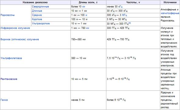 Выдвижение этой гипотезы считается моментом рождения квантовой механики. 3. Квантовые свойства электромагнитного излучения. Электромагнитное излучение принято делить по частотным диапазонам (см. таблицу). Между диапазонами нет резких переходов, они иногда перекрываются, а границы между ними условны. Поскольку скорость распространения излучения (в вакууме) постоянна, то частота его колебаний жёстко связана с длиной волны в вакууме. Радиоволны. Ультракороткие радиоволны принято разделять на метровые, дециметровые, сантиметровые, миллиметровые и субмиллиметровые (микрометровые). Волны с длиной λ < 1 м (ν > 300 МГц) принято также называть микроволнами или волнами сверхвысоких частот (СВЧ). Деление радиоволн на диапазоны см. в статьях Радиоизлучение и Диапазон частот.