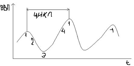 1) Пик (бум), 2) Сжатие (спад), 3) Дно (депрессия), 4) Расширение (оживление).