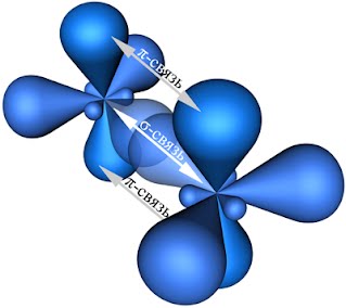 Таким образом, каждый атом C имеет по три гибридных орбитали и по одной негибридной p -орбитали. Две из гибридных орбиталей атомов C взаимно перекрываются и образуют между атомами C σ - связь. Остальные четыре гибридных орбитали атомов C перекрываются в той же плоскости с четырьмя s -орбиталями атомов H и также образуют четыре σ - связь. Две негибридные p -орбитали атомов C взаимно перекрываются в плоскости, которая расположена перпендикулярно плоскости σ - связь, т.е. образуется одна П - связь.
