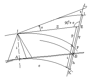 Рис.4.38 Тогда LC + CK = LB + BK и S * tg(ν) + i = V + h. Отсюда выразим превышение h h = S * tg(ν) + i - V. (4.67) Выведем формулу превышения из тригонометрического нивелирования с учетом кривизны Земли и рефракции. Вследствие рефракции луч от верхнего конца вехи идет по кривой, а визирная линия трубы будет направлена по касательной к этой кривой в точке J. Визирная линия трубы пересечет продолжение вехи в точке L1, а не L. Проведем уровенные поверхности в точках A, B, J (рис.4.39). Проведем касательную к уровенной поверхности в точке J и обозначим: высоту прибора - i, высоту вехи - V, горизонтальное проложение линии AB - S. Превышение точки B относительно A выражается отрезком BK. Отрезок L1K на рис.4.39 можно выразить через его части двумя путями: L1K = L1E + EF + FK,