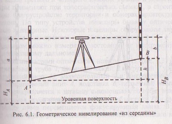 Геометрическое нивелирование основано на применении нивелира, который обеспечивает горизонтальное положение линии визирования. Геометрическое нивелирование может быть выполнено также с помощью теодолита-тахеометра. Различают 2 способа геометрического нивелирования: «из середины» и «вперед». При нивелировании «из середины» нивелир устанавливают посередине между точками.