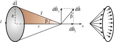 Рассмотрим поле, создаваемое током I, текущим по тонкому проводу, имеющему форму окружности радиуса R. Определим магнитную индукцию на оси проводника с током на расстоянии х от плоскости кругового тока. Векторы При Заметим, что в числителе формулы магнитной индукции кругового тока