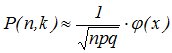 где Формула (3.3) носит название формулы Бернулли. 13.Локальная теорема Лапласа. Пусть проводится n испытаний Бернулли с вероятностью р появления события А в каждом из них. Пусть при этом n достаточно большое число (n >> 1) и npq ≥ 10 (n – большое, а р – не очень маленькое) Тогда вероятность, того, что событие А произойдет ровно k раз может быть найдена по приближенной формуле: где: