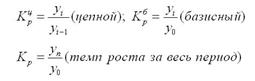Абсолютный прирост может быть положительным или отрицательным знак. Он показывает, на сколько уровень текущего периода выше (ниже) базисного, и таким образом измеряет абсолютную скорость роста или снижение уровня. Темп роста (Тр) — это показатель интенсивности изменения уровня ряда, который выражается в процентах, а в долях выражается коэффициент роста (Кр). Кр определяется как отношение последующего уровня к предыдущему или к показателю принятому за базу сравнения. Он определяет, во сколько раз увеличился уровень по сравнению с базисным, а в случае уменьшения — какую часть базисного уровня составляет сравниваемый. Коэффициент роста может быть рассчитан по формулам: