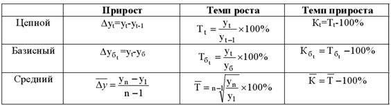 Прогнозирование на основе обобщающих показателей Для количественной оценки динамики явлений применяются статистические показатели: абсолютные приросты, темпы роста, темпы прироста, причем они могут разделяться на цепные, базисные и средние. В основе расчета этих показателей динамики лежит сравнение уровней временного ряда. Если сравнение осуществляется с одним и тем же уровнем, принятым за базу сравнения, то эти показатели называются базисными. Если сравнение осуществляется при переменной базе, и каждый последующий уровень сравнивается с предыдущим, то вычисленные таким образом показатели называются цепными Абсолютный прирост Темп роста Т характеризует отношение двух сравниваемых уровней ряда, выраженное в процентах. Темп прироста К характеризует абсолютный прирост в относительных величинах. Определенный в % темп прироста показывает, на сколько процентов изменился сравниваемый уровень по отношению к уровню, принятому за базу сравнения. В таблице приведены выражения для вычисления базисных и цепных приростов, темпов роста, темпов прироста. При этом использованы следующие обозначения: y1,y2,...,yt,...,yn- уровни временного ряда t=1, 2,..., n; n-длина временного ряда; yб -уровень временного ряда, принятый за базу сравнения. Для получения обобщающих показателей динамики развития определяются средние величины: средний абсолютный прирост, средний темп роста и прироста. Описание динамики ряда с помощью среднего прироста соответствует его представлению в виде прямой, проведенной через две крайние точки. В этом случае, чтобы получить прогноз на один шаг вперед, достаточно к последнему наблюдению добавить значение среднего абсолютного прироста