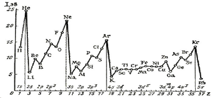 Нарушение тенденции возрастания I наблюдается для атомов с целиком заполненным внешним энергетическим подуровнем (Be), либо для атомов, у которых внешний энергетический подуровень заполнен ровно наполовину (N).