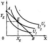 Потребитель выберет тот товар, который расположен на наиболее удаленной кривой безразличия. Среди всех доступных ему товарных наборов, расположенных в границах треугольника ОАВ, указанному требованию отвечает набор Е, находящийся в точке, где бюджетная линия АВ лишь касается кривой безразличия U2.