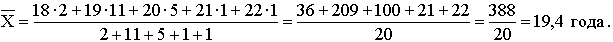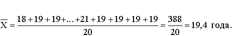 где Xi – варианта (значение) осредняемого признака или серединное значение интервала, в котором измеряется варианта; Приведем в качестве примера расчет среднего возраста студентов в группе из 20 человек: