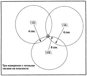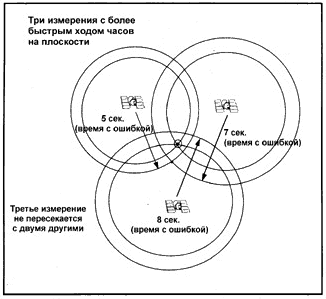 Если часы на спутнике и в приёмнике имеют одинаковую точность хода, то точное местоположение может быть найдено по измерениям расстояния до двух спутников. Если получены измерения с трёх спутников и все часы точные, то круг описанный радиус-вектором от третьего спутника будет пересекаться как показано на рисунке. Однако, если часы в приёмнике спешат на 1 секунду, то картина будет выглядеть следующим образом. Если сделать замер до третьего спутника, то полученный радиус-вектор не пересечётся с двумя другими как показано на рисунке.