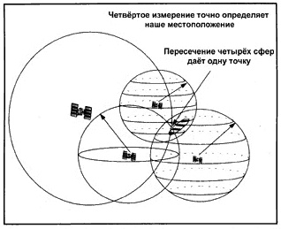 Теперь остаётся только выбрать правильную точку. Однако одна из точек всегда может быть отброшена, так как она имеет высокую скорость перемещения или находится на или под поверхностью Земли. Таким образом, зная расстояние до трёх спутников, можно вычислить координаты определяемой точки.