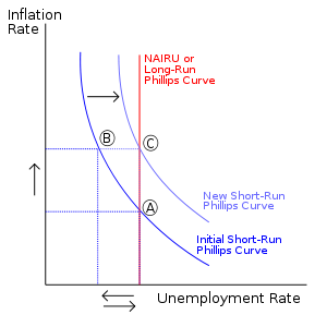 Кривая Филипса в краткосрочном периоде до расширения госрасходов и кривая Филипса в долгосрочном периоде.