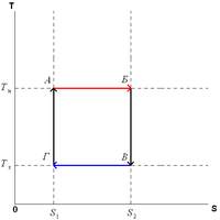 Цикл Карно́ — идеальный термодинамический цикл. Тепловая машина Карно, работающая по этому циклу, обладает максимальным КПД из всех машин, у которых максимальная и минимальная температуры осуществляемого цикла совпадают соответственно с максимальной и минимальной температурами цикла Карно. Состоит из 2 адиабатических и 2 изотермических процессов. Цикл Карно назван в честь французского военного инженера Сади Карно, который впервые его исследовал в 1824 году. Одним из важных свойств цикла Карно является его обратимость: он может быть проведён как в прямом, так и в обратном направлении, при этом энтропия адиабатически изолированной (без теплообмена с окружающей средой) системы не меняется. Описание цикла Карно: