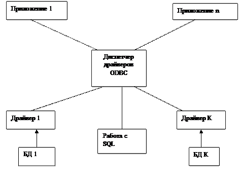 Архитектура ODBC ODBC– это интерфейс, который представляет ПП доступ к системам управления реляционными БД. Он позволяет осуществить максимальную переносимость приложений с одной СУБД на другую без учета их специфики. Это достигается с помощью выделения в интерефейсе двух компонентов: 1)Диспетчера ODBC. 2)Драйверов ODBC. Диспетчер ODBC предполагает единый интерфейс всем приложениям, работающим с БД. Он представляет собой набор функций, с помощью которых выполняются все задачи, связанные с СУБД. Интерфейс диспетчера ODBC одинаков независимо от того, с какой СУБД приложение будет взаимодействовать. Драйвер ODBC, напротив, зависит от СУБД. Диспетчер вызывает нужный драйвер. Драйвер преобразует запросы на обслуживание от приложений в запросы на языке конкретной БД. Каждая СУБД, поддерживающая технологию ODBC, должна предоставлять разработчикам приложений драйвер ODBC для этой СУБД.