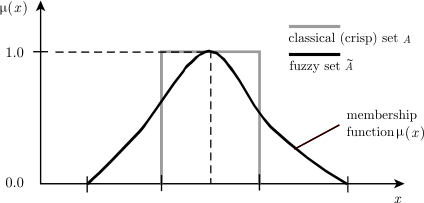 [править]Применения Нечёткое множество B, где B = {(3,0.3), (4,0.7), (5,1), (6,0.4)} в стандартных обозначениях теории нечётких множеств обычно записывается как B = {0.3/3, 0.7/4, 1/5, 0.4/6}. Заметим, что произвольное значение со степенью принадлежности нуль zero не появляется в этом выражении нечёткого множества. Стандартное обозначение для степени принадлежности нечёткому множеству B значения 6 выглядит так: μB(6) = 0.4. [править]Нечёткая логика В качестве расширения многозначной логики оценками (valuations) ( Иногда это расширение называют «нечёткой логикой в узком смысле» в противопоставление «нечёткой логике в широком смысле», которая возникла в прикладных областях автоматического управления и инженерии знаний, и которая охватывает много тем, включающих нечёткие множества и «приближенные рассуждения». Промышленные применения нечётких множеств в контексте «нечёткой логики в широком смысле» можно найти в нечёткой логике. [править]Нечёткое число Нечёткое число — это выпуклое, нормализованное нечёткое множество [править]Нечёткий интервал Нечёткий интервал — это неопределенное множество