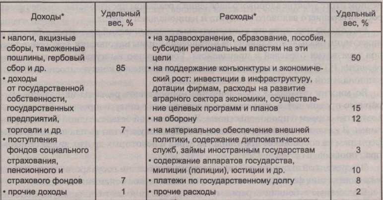Государственный бюджет - это крупнейший централизованный денежный фонд, находящийся в распоряжении правительства. Совокупность входящих в него организационных структур образует бюджетную систему. Она формируется с учетом совокупности социально-экономических, правовых, административных особенностей. Структура бюджетной системы той или иной страны зависит прежде всего от ее государственного устройства. В странах, имеющих унитарное устройство, бюджетная система имеет двухъярусное построение — государственный и местный бюджет. В странах с федеральным государственным устройством имеются промежуточные звенья — бюджеты штатов, земель, субъектов федерации. Функции:1)Распределительная функция предполагает концентрацию денежных средств в государстве через различные каналы поступления и их использование для выполнения государственных целей и функций. В некоторых странах эту функцию выполняет государственное казначейство через свои региональные органы. 2) Контрольная функция проявляется в проведении контролирующих мер за процессом формирования и использования денежных средств в различных структурных звеньях экономики. Осуществляют ее налоговые инспекции и налоговая полиция, государственные казначейства, Центральный банк и другие органы. Государственный бюджет образует централизованный фонд денежных ресурсов правительства для содержания государственного аппарата, вооруженных сил, здравоохранения, образования, выплаты социальных пособий. К бюджету относятся также различные внебюджетные фонды или денежные средства, имеющие целевое назначение. По своему количественному составу они не всегда включаются в состав бюджета. Но по принципу распределения и использования они равнозначны государственным бюджетным расходам. Находятся они в распоряжении центральных и местных органов власти, концентрируясь в определенные целевые фонды. Это пенсионные фонды, внебюджетные и другие, которые создаются за счет специальных налогов, займов и субсидий из бюджета. Структура бюджета по доходам и расходам. Доходы государственного бюджета на 85% формируются за счет налоговых поступлений, прибыли казенной промышленности, поступлений от приватизации собственности и т. д. Общая сумма доходов в идеале должна покрывать запрограммированные расходные статьи бюджета. В случае если расходы превышают доходную часть в общей структуре, образуется бюджетный дефицит.