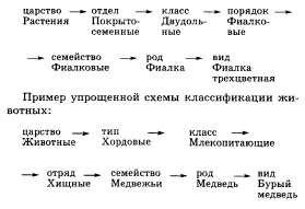 1. Многообразие видов на Земле: 1,5—2 млн видов животных, 350—500 тыс. видов растений, примерно 100 тыс. видов грибов. Систематика — наука о многообразии и классификации организмов. Карл Линней — основоположник систематики. Принцип бинарной номенклатуры: двойные латинские названия каждого вида (клевер ползучий, береза бородавчатая, воробей полевой, капустная белянка и др.). 2. Деление органического мира на два надцар-ства: ядерные (эукариоты) и безъядерные (доядер-ные, или прокариоты) и четыре царства: Растения, Грибы, Животные, Бактерии и цианобактерии. 3. Бактерии и синезеленые, или цианобактерии — одноклеточные простоорганизованные безъядерные организмы, автотрофы или гетеротрофы, посредники между неорганической природой и над-царством ядерных. Бактерии — разрушители органических веществ, их роль в разложении органических веществ до минеральных. Роль цианобактерии в биосфере — заселение бесплодных субстратов (камни, скалы и др.) и подготовка их для заселения разнообразными организмами. 4. Грибы — одноклеточные и многоклеточные организмы, обитающие как на суше, так и в воде. Гетеротрофы. Роль грибов в круговороте веществ в природе, в превращении органических веществ в минеральные, в почвообразовательных процессах. 5. Растения — одноклеточные и многоклеточные организмы, большинство которых в клетках содержит пигмент хлорофилл, придающий растению зеленую окраску. Растения — автотрофы, синтезируют органические вещества из неорганических с использованием энергии солнечного света. Растения — основа для существования всех других групп организмов, кроме синезеленых и ряда бактерий, так как растения снабжают их пищей, энергией, кислородом. 6. Животные — царство организмов, активно передвигающихся в пространстве (исключение составляют некоторые полипы и др.). Гетеротрофы. Роль в круговороте веществ в природе — потребители органического вещества. Транспортная функция животных в биосфере — переносят вещество и энергию. 7. Родство, общность происхождения организмов — основа их классификации. Основные систематические категории. Пример упрощенной схемы классификации растений: