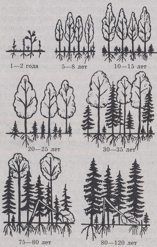 Ю. Одум (1986) под экологической сукцессией понимает вообще весь процесс развития экосистемы. Более конкретное определение дает этому явлению Н. Ф. Реймерс (1990): «Сукцессия — последовательная смена биоценозов, преемственно возникающая на одной и той же территории (биотопе) под влиянием природных факторов (в том числе и внутренних противоречий самих биоценозов) или воздействия человека». Изменения в сообществе в результате сукцессии носят закономерный характер и обусловлены взаимодействием организмов между собой и с окружающей абиотической средой. Экологическая сукцессия происходит в определенный отрезок времени, в который изменяется видовая структура сообщества и абиотическая среда его существования вплоть до куль- минации его развития — возникновения стабилизированной системы. Такую стабилизированную экосистему называют климаксом. В этом состоянии система находится тогда, когда в ней на единицу энергии приходится максимальная биомасса и максимальное количество симбиотических связей между организмами (Ю. Одум, 1975). Однако к этому состоянию система проходит через ряд стадий развития, первые из которых часто называют стадией первых поселенцев. Поэтому в более узком смысле сукцессия — это последовательность сообществ, сменяющих друг друга в данном районе. Стабильность сообщества может быть длительной лишь в том случае, если изменения среды, вызванные одними организмами, точно компенсируются деятельностью других, с противоположными экологическими требованиями. Это условие нарушается при нарушении круговорота веществ и тогда часть популяций, которые не могут выдержать конкуренции, вытесняются другими, для которых эти условия благоприятны, и го-меостаз восстанавливается. ШШ Для возникновения сукцессии необходимо свободное пространство. В зависимости от первоначального состояния субстрата, различают первичную и вторичную сукцессии. Первичная сукцессия — формирование сообществ начинается на первоначально свободном субстрате, а вторичная сукцессия — это последовательная смена одного сообщества, существовавшего на данном субстрате, другим, более совершенным для данных абиотических условий. Первичная сукцессия позволяет проследить формирование сообществ с самого начала. Она может возникнуть на склоне после оползня или обвала, на образовавшейся отмели при отступлении моря и изменении русла рекой, на обнаженных эоловых песках пустыни, не говоря уже об антропогенных нарушениях: свежая лесосека, намывная полоса морского побережья, искусственные водохранилища. Первыми, как правило, на свободное пространство начинают внедряться растения посредством перенесенных ветром спор и семян, либо за счет вегетативных органов оставшихся по соседству растений. В качестве примера первичной сукцессии обычно приводят зарастание еловым лесом новых территорий на севере нашей страны. Ельник — это последняя климаксная стадия развития экосистемы в климатических условиях Севера, т.е. уже коренной биоценоз. Вначале же здесь развиваются березняки, ольховники, осинники, под пологом которых растут ели. Постепенно они перерастают березу и вытесняют ее, захватывая пространство (рис. 5.9). Семена обеих древесных пород легко переносятся ветром, но, если даже они прорастут одновременно, бе-