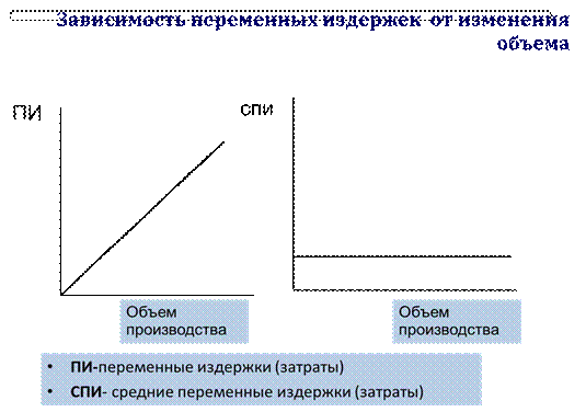 К переменным обычно относят затраты: • на сырье и материалы, • топливо, • энергию, • транспортные услуги, • часть трудовых ресурсов, т.е. те издержки, уровень которых изменяется с изменением объема производства