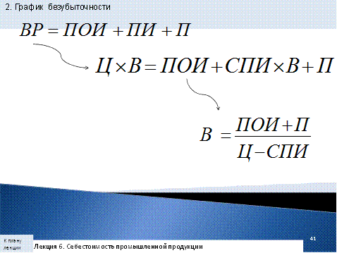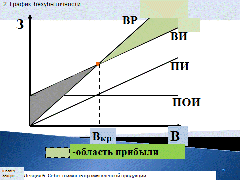 З – затраты В – объем производства ВИ – валовые затраты (ВИ=ПОИ+ПИ) ПИ – переменные затраты ПОИ – постоянные издержки ВР=Ц*В (Ц – цена единицы продукции) Точка пересечения ВР и ВИ называется точкой безубыточности. В данной точке у предприятия нет ни прибыли, ни убытков. Объем производства соответствует точке безубыточности, носит название критического. При объеме производства ниже критического предприятие своей выручкой не может покрыть затраты, следовательно, предприятие несет убытки. Если В превышает критические, соответственно, предприятие получает прибыль. Ниже выпуска критического идет область убытков, выше объема производства – область прибыли. Точка безубыточности может быть определена: