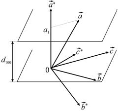 1. Если обычная прямая решетка построена на векторах трансляций a,b,c, то оси обратной к ней решетки a*,b*,c* определяются как векторные произведения: a* = bc, b* = ca, c* = ab 2. Осевые параметры обратной решетки a*,b*,c* равны обратным величинам межплоскостных расстояний плоских сеток прямой решетки, нормальных к этой оси. Т. е. вектор обратной решетки H*hkl нормален к каждой плоскости прямой решетки (hkl), а его длина определяется как величина, обратная межплоскостному расстоянию dhkl. Решетка с вектором H*hkl, построенная на базисных векторах a*,b*,c* называется обратной решеткой, векторы a*,b*,c* — координатными векторами обратной решетки. Каждой плоскости (hkl) прямой решетки отвечает в обратной решетке узел [[hkl]]*. Бесконечному семейству параллельных плоскостей hkl в пространстве прямой решетки соответствует в пространстве обратной решетки бесконечное семейство точек [[hkl]]* вдоль направления, нормального к этим плоскостям. Зоне плоскостей прямой решетки отвечает сетка из точек (узлов) обратной решетки, причем ось зоны прямой решетки нормальна к плоскости сетки обратной решетки. Прямой пространственной решетке из плоскостей hkl отвечает обратная трехмерная решетка из точек [[hkl]]*. Основные векторы a*,b*,c* обратной решетки определяются также скалярными произведениями: aa* = bb* = cc* = 1; a*b = a*c = b*c = b*a = c*b = c*a = 0 Прямая и обратная решетка сопряжены взаимно, т. е. решетка, построенная на осях a,b,c, является обратной по отношению к решетке a*,b*,c*, а решетка, построенная на векторах a*,b*,c*, - обратной по отношению к решетке a,b,c.