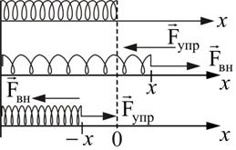 Упругими называются силы, возникающие при упругих деформациях тел. Электромагнитные силы в механике проявляют себя как упругие силы и силы трения. Под действием внешних сил возникают деформации (т.е. изменение размеров и формы) тел. Если после прекращения действия внешних сил восстанавливаются прежние форма и размеры тела, то деформация называется упругой. Деформация имеет упругий характер в случае, если внешняя сила не превосходит определенного значения, называемого пределом упругости. При превышении этого предела деформация становится пластичной, или неупругой, т.е. первоначальные размеры и форма тела полностью не восстанавливаются. Рассмотрим упругие деформации. В деформированном теле (рис. 4.2) возникают упругие силы, уравновешивающие внешние силы. Под действием внешней силы – F вн пружина получает удлинение x, в результате в ней возникает упругая сила – F упр, уравновешивающая F вн.