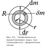 Сплошной шар массы m и радиуса R можно рассматривать как совокупность бесконечно тонких сферических слоев с массами dm, радиусом r, толщиной dr (рис.35).