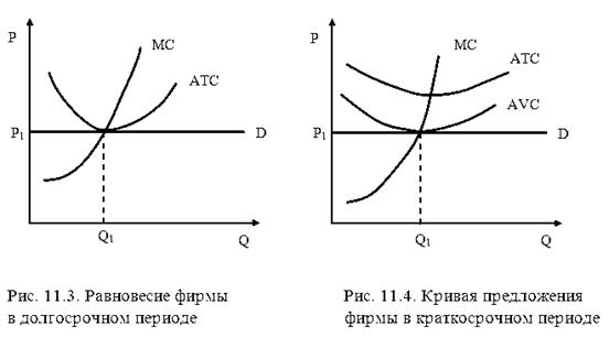 Совершенная конкуренция — экономическая модель, идеализированное состояние рынка, когда отдельные покупатели и продавцы не могут влиять на цену, но формируют её своим вкладом спроса и предложения. Она возникает в сферах, где много продавцов и покупателей стандартизированного товара. Спрос на продукцию отдельной фирмы в условиях совершенной конкуренции абсолютно эластичен, кривая спроса – горизонтальная линия. Объем пр-ва будет определяться как MR=MC (предельный доход=предельные издержки). Положение конкурентной фирмы зависит от рыночной цены на продукт и уровня её издержек. Если цена продукта превышает средние общие издержки (АТС) на его производство, то фирма получает экономическую прибыль (см. рис. 11.1.). Если рыночная цена равна АТС, то фирма получает нормальную прибыль (см. рис. 11.3.). Если рыночная цена ниже АТС, то фирма несёт убытки (см. рис. 11.2). Производство прекращается, если цена товара падает ниже минимального уровня средних переменных издержек (АVС). В краткосрочном периоде графически кривая предложения фирмы, максимизирующей прибыль, совпадает с восходящей частью кривой предельных издержек, которая лежит выше точки минимума средних переменных издержек (см. рис. 11.4.).