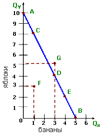 Положение бюджетной линии определяется двумя точками А, В. Предположим, что на покупку фруктов еженедельно выделяется 5 рублей (I=5). Одно яблоко стоит 50 копеек, а банан - 1 рубль. Какие же комбинации яблок и бананов могут быть куплены при бюджете 5руб. в неделю (Рис.4)? Если бы потребитель все деньги истратил на бананы, то он приобрел бы их в количестве 5 штук. I:1=5(шт) Если бы весь доход был истрачен на яблоки, то их было бы куплено 10 штук. I:0,5=10 (шт)
