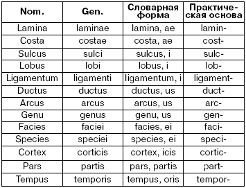 Существительные приводятся в словаре и заучиваются в словарной форме, которая содержит 3 компонента: 1) форму слова в им. п. ед. ч.; 2) окончание род. п. ед. ч.; 3) обозначение рода – мужского, женского или среднего (сокращенно одной буквой: m, f, n). Например: lamina, ae (f), sutura, ae (f), sulcus, i (m); ligamentum, i (n); pars, is (f), margo, is (m); os, is (n); articulatio, is (f), canalis, is (m); ductus, us (m); arcus, us (m), cornu, us, (n); facies, ei (f). У некоторых существительных III склонения перед окончанием род. п. ед. ч. – is приписана и конечная часть основы. Это необходимо, если основа слова в род. п. ед. ч. не совпадает с основой им. п. ед. ч.: