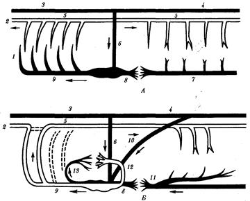 Рис. 14.27. Строение кровеносной системы водных (А) и наземных (Б) позвоночных: 1 —жаберные артерии, 2—сонная артериям—передняя кардинальная вена, 4— задняя кардинальная вена, 5— спинная аорта, 6— кювьеров проток, 7—подкишечная вена, 8— печеночная вена, 9—брюшная аорта, 10— задняя (нижняя) полая вена, 11 —воротная вена печени, 12— легочная вена, 13— легочная артерия; стрелками указано направление движения крови