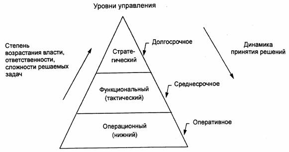 Операционный (нижний) уровень управления обеспечивает решение многократно повторяющихся задач и операций и быстрое реагирование на изменения входной текущей информации. На этом уровне достаточно велики как объем выполняемых операций, так и динамика принятия управленческих решений. Этот уровень управления часто называют оперативным из-за необходимости быстрого реагирования на изменение ситуации. На уровне оперативного (операционного) управления большой объем занимают учетные задачи. Пример 2. Некоторые учетные задачи: Функциональный (тактический) уровень управления обеспечивает решение задач, требующих предварительного анализа информации, подготовленной на первом уровне. На этом уровне большое значение приобретает такая функция управления, как анализ. Объем решаемых задач уменьшается, но возрастает их сложность. При этом не всегда удается выработать нужное решение оперативно, требуется дополнительное время на анализ, осмысление, сбор недостающих сведений и т.п. Управление связано с некоторой задержкой от момента поступления информации до принятия решений и их реализации, а также от момента реализации решений до получения реакции на них. Пример 3. На основании анализа статистических данных по спросу на продукцию о ценах конкурентов и пр. прогнозируется прибыль и разрабатывается план выпуска продукции на ближайший период (неделю, месяц, квартал). Результаты принимаемых управленческих решений проявляются спустя некоторое время. Стратегический уровень обеспечивает выработку управленческих решений направленных на достижение долгосрочных стратегических целей организации. Поскольку результаты принимаемых решений проявляются спустя длительное время, особое значение на этом уровне имеет такая функция управления, как стратегическое планирование. Прочие функции управления на этом уровне в настоящее время разработаны недостаточно полно. Часто стратегический уровень управления называют стратегическим или долгосрочным планированием. Правомерность принятого на этом уровне решения может быть подтверждена спустя достаточно длительное время. Могут пройти месяцы или годы. Ответственность за принятие управленческих решений чрезвычайно велика и определяется не только результатами анализа с использованием математического и специальной: аппарата, но и профессиональной интуицией менеджеров. Пример 4. На основании анализа финансового состояния фирмы принимаются решения об увеличении (уменьшении, снятии с продажи) производимой продукции, о привлечении дополнительных работников или об их сокращении.