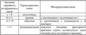 Линейный коэффициент корреляции может принимать значения в пределах от -1 до + 1 или по модулю от 0 до 1. Чем ближе он по абсолютной величине к 1, тем теснее связь. Знак указывает направление связи: «+» - прямая зависимость, «-» имеет место при обратной зависимости.