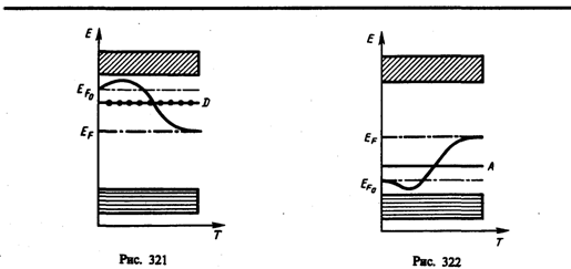 Таким образом, в полупроводниках с примесью, валентность которой на единицу меньше валентности основных атомов, носителями тока являются дырки; возникает дырочная проводимость (проворность p -типа). Полупроводники с такой проводимостью называются дырочными (или полупроводниками p -типа). Примеси, захватывающие электроны из валентной зоны полупроводника, называются акцепторами, а энергетические уровни этих примесей — акцепторными уровнями. В отличие от собственной проводимости, осуществляющейся одновременно электронами и дырками, примесная проводимость полупроводников обусловлена в основном носителями одного знака: электронами — в случае донорной примеси, дырками — в случае акцепторной. Эти носители тока называются основными. Кроме основных носителей в полупроводнике имеются и неосновные носители: в полупроводниках n -типа — дырки, в полупроводниках p- типа — электроны. Наличие примесных уровней в полупроводниках существенно изменяет положение уровня Ферми ЕF. Расчеты показывают, что в случае полупроводников n -типа уровень Ферми ЕF0 при 0 К расположен посередине между дном зоны проводимости и донорным уровнем (рис. 321), С повышением температуры все большее число электронов переходит из донорных состояний в зону проводимости, но, помимо этого, возрастает и число тепловых флуктуаций, способных возбуждать электроны из валентной зоны и перебрасывать их через запрещенную зону энергий. Поэтому при высоких температурах уровень Ферми имеет тенденцию смещаться вниз (сплошная кривая) к своему предельному положению в центре запрещенной зоны, характерному для собственного полупроводника. Уровень Ферми в полупроводниках р- типа при 0 К ЕF0 располагается посередине между потолком валентной зоны и акцепторным уровнем (рис. 322). Сплошная кривая опять-таки показывает его смещение с температурой. При температурах, при которых примесные атомы оказываются полностью истощенными и увеличение концентрации носителей происходит за счет возбуждения собственных носителей, уровень Ферми располагается посередине запрещенной зоны, как в собственном полупроводнике.