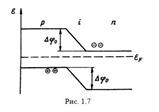 Отметим, что р-п переход в целом должен быть электронейтральным, т.е. отрицательный заряд левой части и положительный заряд правой части должны быть одинаковы. Поскольку в рассматриваемом нами случае N A = 2 N Д(несимметричный переход), протяженность областей расположения заряд оказывается разной: одну треть i -области занимают акцепторы, а две трети доноры. Таким образом, большая часть обедненной области сосредоточивается в слаболегированном (высокоумном) слое. В реальных р-п переходах концентрации доноров и акцепторов отличаются на несколько порядков. В таких несимметричных переходах практически весь обедненный слой сосредоточен в слаболегированной части. Ширина обедненного слоя (i -области) в равновесном состоянии l 0 (см. рис. 1.6, б) является важным параметром р-п перехода. Другим, не менее важным параметром равновесного состояния является высота потенциального барьера (контактная разность потенциалов) ∆φ0. Этот параметр показан на зонной энергетической диаграмме р-п перехода, изображенной на рис. 1.7 (где εF- уровень Ферми). Потенциальный барьер образуется электрическим полем пространственного заряда обедненного слоя. При отсутствии внешнего поля (равновесное состояние) уровень Ферми является общим для всего объема полупроводника и расположен в запрещенной зоне. Поскольку в полупроводнике п -типа уровень Ферми смещен вверх относительно середины запрещенной зоны, а в полупроводнике р -типа вниз, то разрешенные зоны дырочной области должны располагаться на более высоких энергиях, чем разрешенные зоны электронной энергии. Следовательно, в обедненном слое диаграмма энергетических зон искривляется. Заметим, что в i -области уровень Ферми проходит вблизи середины запрещенной зоны.