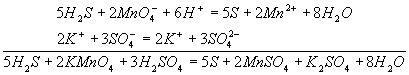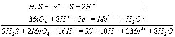 Н2S → S + 2H+ Эта схема уравнена по числу атомов. Для уравнивания по числу зарядов надо от левой части схемы отнять два электрона, после чего можно стрелку заменить на знак равенства: Н2S - 2е- = S + 2H+ Это первая полуреакция - процесс окисления восстановителя Н2S. Обесцвечивание раствора связано с переходом иона MnO4- (он имеет малиновую окраску) в ион Mn2+ (практически бесцветный и лишь при большой концентрации имеет слабо-розовую окраску), что можно выразить схемой MnO4- → Mn2+ В кислом растворе кислород, входящий в состав ионов МnО4, вместе с ионами водорода в конечном итоге образует воду. Поэтому процесс перехода записываем так: MnO4- + 8Н+→ Мn2+ + 4Н2О Чтобы стрелку заменить на знак равенства, надо уравнять и заряды. Поскольку исходные вещества имеют семь положительных зарядов (7+), а конечные - два положительных (2+), то для выполнения условия сохранения зарядов надо к левой части схемы прибавить пять электронов: MnO4- + 8Н+ + 5e-= Mn2+ + 4Н2О Это вторая полуреакция - процесс восстановления окислителя, т.е. перманганат-иона Для составления общего уравнения реакции надо уравнения полуреакций почленно сложить, предварительно уравняв числа отданных и полученных электронов. В этом случае по правилам нахождения наименьшего кратного определяют соответствующие множители, на которые умножаются уравнения полуреакций. Сокращенно запись проводится так: И, сократив на 10Н+, окончательно получим 5Н2S + 2MnO4- + 6H+ = 5S + 2Mn2+ + 8Н2О Проверяем правильность составленного в ионной форме уравнения: число атомов кислорода в левой части 8, в правой 8; число зарядов: в левой части (2-)+(6+) = 4+, в правой 2(2+) = 4+. Уравнение составлено правильно, так как атомы и заряды уравнены. Методом полуреакций составляется уравнение реакции в ионной форме. Чтобы от него перейти к уравнению в молекулярной форме, поступаем так: в левой части ионного уравнения к каждому аниону подбираем соответствующий катион, а к каждому катиону - анион. Затем те же ионы в таком же числе записываем в правую часть уравнения, после чего ионы объединяем в молекулы: Таким образом, составление уравнений окислительно-восстановительных реакций с помощью метода полуреакций приводит к тому результату, что и метод электронного баланса. Сопоставим оба метода. Достоинство ыметода полуреакций по сравнению с методом электронного баланса в том. что в нем применяются не гипотетические ионы, а реально существующие. В самом деле, в растворе нет ионов При методе полуреакций не нужно знать степень окисления атомов. Написание отдельных ионных уравнений полуреакций необходимо для понимания химических процессов в гальваническом элементе и при электролизе. При этом методе видна роль среды как активного участника всего процесса. Наконец, при использовании метода полуреакций не нужно знать все получающиеся вещества, они появляются в уравнении реакции при выводе его.Поэтому методу полуреакций следует отдать предпочтение и применять его при составлении уравнений всех окислительно-восстановительных реакций, протекающих в водных растворах.