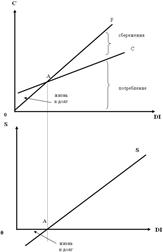Автономное потребление не зависит от дохода, оно возможно засчет S и займов. Потребление в каждой точке биссектрисы равно доходу, т.е. S=0, но в реальности расходуется только часть дохода и кривая потребления имеет вид C. При C>S население живет в долг или засчет автономных сбережений (доход бедной нации). При C<S часть дохода идет на сбережения. C и S растут абсолютно, но C может уменьшаться, а S при этом увеличиваться.