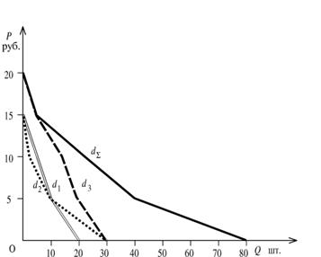 Индивидуальное предложение - это соответствующее каждой данной цене количество товара, которое готов предложить к продаже на рынке тот или иной производитель (продавец). Рыночное предложение - это соответствующее каждой данной цене количество товара, которое готово предложить к продаже на рынке то или иное неопределённое количество производителей (продавецов). Переход к рыночному предложению аналогичен переходу от индивидуального к рыночному спросу. При этом возможно использование обоих методов: табличного и графического. Приведем пример графического решения. Пусть на рынке имеются только две фирмы производителя A и B. Зависимость их индивидуального предложения от цены представлена на двух первых графиках (рис. 27).