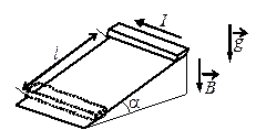С5. Тонкий металлический брусок прямоугольного сечения, имеющий длину L и массу m, соскальзывает из состояния покоя по гладкой наклонной плоскости в вертикальном магнитном поле с индукцией В. По стержню протекает электрический ток I в направлении, указанном на рисунке. Плоскость наклонена к горизонту под углом a. Продольная ось бруска при движении сохраняет горизонтальное направление. Найдите время, в течение которого брусок пройдет по наклонной плоскости расстояние l.