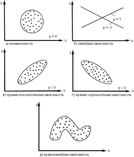 Если р = 1 или р = -1, то между случайными величинами Х и Y существует линейная функциональная зависимость (Y = c + dX). В этом случае говорят о полной корреляции. При р = 1 значения xi, yi определяют точки, лежащие на прямой линии, имеющей положительный наклон (с увеличением xi значения yi также увеличиваются), при р = -1 прямая имеет отрицательный наклон (рисунок 5, б). В промежуточных случаях (-1 < p < 1) точки, соответствующие значениям xi, yi, попадают в область, ограниченную некоторым эллипсом (рисунок 5, в, г), причем при p > 0 имеет место положительная корреляция (с увеличением xi значения yi имеют тенденцию к возрастанию), при p < 0 корреляция отрицательная. Чем ближе р к, тем уже эллипс и тем теснее экспериментальные значения группируются около прямой линии. Здесь же следует обратить внимание на то, что линия, вдоль которой группируются точки, может быть не только прямой, а иметь любую другую форму: парабола, гипербола и т. д. В этих случаях мы рассматривали бы так называемую, нелинейную (или криволинейную) корреляцию. Таким образом, визуальный анализ корреляционного поля помогает выявить не только наличия статистической зависимости (линейную или нелинейную) между исследуемыми признаками, но и ее тесноту и форму. Это имеет существенное значение для следующего шага в анализе ѕ выбора и вычисления соответствующего коэффициента корреляции. Корреляционную зависимость между признаками можно описывать разными способами. В частности, любая форма связи может быть выражена уравнением общего вида Y = f(X), где признак Y – зависимая переменная, или функция от независимой переменной X, называемой аргументом. Соответствие между аргументом и функцией может быть задано таблицей, формулой, графиком и т. д.