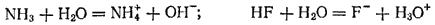 Изучение подобного рода реакций, а также реакций, протекающих в иеводиых средах, привело к созданию более общих представлений о кислотах и основаниях. К важнейшим из современных теории кислот и оснований принадлежит протонная теория, выдвинутая в 1923 г. Согласно протонной теории, кислотой является донор протона, т. е. частниа (молекула или ион), которая способна отдавать ион водорода — прогон, а основанием — акцептор протона, т. е. частица (молекула или ион), способная присоединять протон. Соотношение между кислотой и основанием определяется схемой: