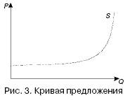 Предложение S – это товары, которые находятся на рынке или могут быть туда доставлены по определенной цене P. Следует различать натурально—вещественную (по ассортименту) истоимостную (выраженную в деньгах, ценах сумму товаров) формы товарного предложения. Кривая предложения отражена на рисунке 3.