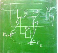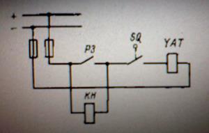 Рис. Контроль исправности в цепи отключения выключателя с помощью реле КН. В случае замыкания на землю в точках К1 и К2, контакты РЗ шунтируются и в электромагните отключения выключателя (YAT) выключателя, появляется тока и выключатель может ложно выключится. Что бы предупредить подобное отключение, применяется контроль за появлением земли на постоянном токе. Контроль осуществляется с помощью вольтметров V1 и V2 и сигнального реле KL-(смотри предыдущую схему). В следствии надежности аккумуляторные батарей устанавливаются на всех электростанциях и подстанциях с напряжением 110 кВ и выше.