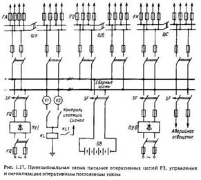ИСТОЧНИКИ И СХЕМЫ ОПЕРАТИВНОГО ТОКА(учебник - Чернобров РЗ Эн.систем) Назначение и основные требования. Источники оперативного тока осуществляют питание цепей дистанционного управления выключателями, устройств РЗ, автоматики и других средств управления. Питание оперативных цепей управления, цепей РЗ и других устройств, от которых зависит отключение поврежденных элементов энергосистемы и ликвидация ненормальных режимов, должно отличаться особой надежностью. Поэтому главное требование, которому должен отвечать источник оперативного тока, состоит в том, чтобы во время любых повреждений и ненормальных режимов напряжение источника оперативного тока и его мощность всегда имели достаточное значение как для безотказного действия устройств РЗ, автоматики, телемеханики и сигнализации, так и для надежного отключения и включения соответствующих выключателей. Для питания оперативных цепей применяются источники постоянного и переменного тока. Постоянный оперативный ток. В качестве источника постоянного тока служат аккумуляторные батареи с номинальным напряжением 220-110 В; на небольших подстанциях иногда применяются батареи 48 В. От аккумуляторных батарей осуществляется централизованное питание всех устройств РЗ, автоматики, цепей управления и сигнализации. Аккумуляторная батарея GB подключается к сборным шинам (рис. 1.17), от которых получают питание все потребители постоянного тока. Аккумуляторные батареи обычно работают в режиме постоянного подзаряда, что позволяет обеспечить их непрерывную готовность к действию в полностью заряженном состоянии. Для этой цели на сборные шины параллельно GB включается постоянно работающее подзарядное устройство (ПУ). Первоначально подобные устройства выполнялись в виде генератора постоянного тока, приводимого в действие электродвигателем, получающим питание от сети переменного тока; в последнее время стали применяться полупроводниковые выпрямители. Самым ответственным участком являются цепи РЗ и автоматики, цепи управления силовыми выключателями и их электромагнитов отключения (ЭО) - они получают питание от шинок, называемых шинками управления ШУ. Вторым по значению участком являются цепи электромагнитов включения (ЭВ) выключателей, питающиеся также от отдельных шинок ШВ. Третьим по значению участком, менее ответственным, является сигнализация, питающаяся от шинок ШС. Остальные потребители постоянного тока (аварийное освещение, некоторые электродвигатели собственных нужд) образуют четвертый участок, питающийся от отдельной шинной сборки или непосредственно от сборных шин; шинки ШУ, ШВ, ШС по соображениям надежности секционируются. На ЭС и крупных узловых ПС главные сборные шины питания цепей управления для повышения надежности (при повреждениях на главных шинах) выполняются в виде двух секций, каждая из которых получает питание от аккумуляторной батареи через автоматические выключатели или предохранители. Потребители, подключенные к шинкам ШУ, ШВ, ШС, подразделяются на участки по территориальному принципу (РУ 220, ПО кВ; щит управления и т. п.). Каждый такой учас