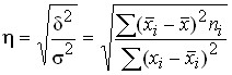 Следовательно, общая вариация признака в совокупности должна определяться как сумма вариации групповых средних (за счет одного выделенного фактора) и остаточной вариации (за счет остальных факторов). Это равенство находит отражение в правиле сложения дисперсий Отношение межгрупповой дисперсии Коэффициент эмпирического корреляционного отношения