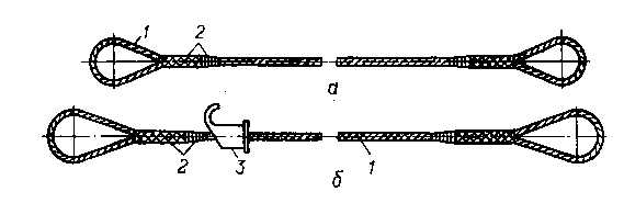 а) - строп типу СКП першого виконання; б) – строп типу СКП другого виконання. 1 – сталевий канат; 2 – заплітання (20 діаметрів); 3 – сталева втулка з гаком.